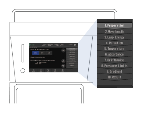 Otomatik doğrulama işlevi, solvent dağıtım kararlılığını, dalga boyu doğruluğunu, absorbans doğruluğunu, gradyan doğruluğunu, herhangi bir sapma/gürültü olup olmadığını ve diğer parametreleri inceler.