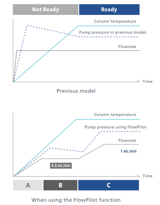 UHPLC kromatografi kolonları, özellikle polimerik paketleme için geçerli olmak üzere, ani pompa başlangıcı ve aşırı gradyan değişikliklerinden zarar görebilir. Akıllı Akış Kontrolü (FlowPilot), kolon fırınının durumuna göre debiyi kademeli olarak yöntem ayar noktasına yükselterek kolonlarınızın ömrünü uzatır.