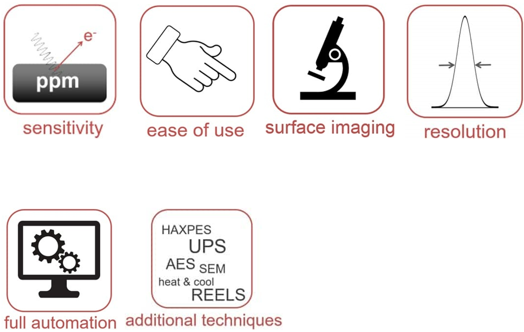 Patentli AXIS teknolojisi ile spektroskopi modunda yüksek elektron toplama verimliliği ve paralel görüntüleme modunda yüksek büyütme oranlarında düşük sapmaları sağlar. XPS spektroskopisi ve görüntüleme sonuçları, Ultraviyole Fotoemisyon Spektroskopisi (UPS), Schottky alan emisyon taraması Auger Mikroskobu (SAM), İkincil Elektron Mikroskobu (SEM) ve İyon Saçılma Spektroskopisi (ISS) gibi ek yüzey analiz teknikleri ile tamamlanabilir.