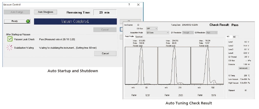 Kütle spektrometresi vakum durumunda çalıştırılmalıdır, sistemin başlatılması ve durdurulması duruma bağlı olarak zaman alır. Bunu belirlemek zor olabilir. Sistemin başlatılması veya durdurulması sırasında geçen süre gerçek zamanlı olarak görüntülendiğinden, iyon kaynağının bakımının veya analizinin ne zaman mümkün olduğunu doğru bir şekilde belirlemek kolaydır. Ayrıca, sistem açılışında sızıntı kontrolleri ve otomatik ayarlama gibi şimdiye kadar kullanıcı tarafından yapılması gereken görevler artık otomatik olarak gerçekleştirilir.