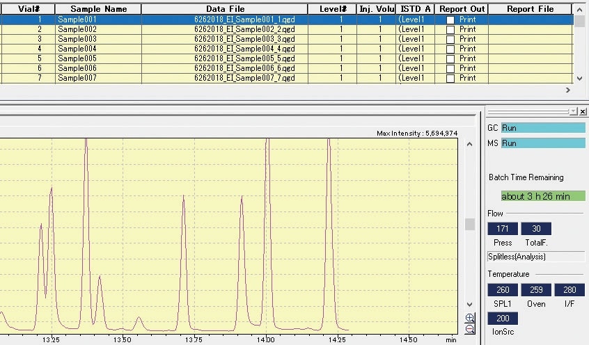 Shimadzu GCMS-TQ8040 NX Üçlü Dört Kutuplu Gaz Kromatografi Kütle Spektrometri ile sürekli analiz için gereken süreyi gerçek zamanlı olarak görüntüleyerek, mevcut sürekli analizin ne zaman biteceği doğru bir şekilde doğrulanabilir. Bu, sürekli analiz sırasında veya farklı kullanıcılar arasında geçiş yaparken gereken bekleme süresini azaltarak cihazın çalışma süresini (aktif süre) artırır. Ayrıca, bu işlev, önceki analizin bitiş zamanına dayalı olarak numune hazırlama ve ön işleme gibi analiz hazırlıkları için zamanlamanın planlanmasını kolaylaştırdığı için analitik süreçlerin daha verimli bir şekilde gerçekleştirilmesini sağlar.