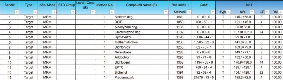 Shimadzu “Smart Database”, “Akıllı MRM” işlevini kullanarak metod dosyalarını oluşturmak için bir veritabanı dosyasıdır. Bileşik bilgi ve geçişlere ek olarak, veri tabanı dosyasına alıkoyma indeksi kaydedilebilir. Otomatik Ayar Tutma Süresi (AART) işlevi kullanılırken standart numuneler analiz edilerek, tutma süresi hesaplanmadan yöntem oluşturmaya devam edilebilir. MRM bilgilerine ek olarak, tarama ve SIM iyon bilgileri, kütle spektrumları ve dahili standart yöntemden gelen kalibrasyon eğrisi bilgileri de veritabanı dosyasına kaydedilebilir. Bu, kullanıcıların kendi veritabanlarını kolayca oluşturmalarını sağlar.