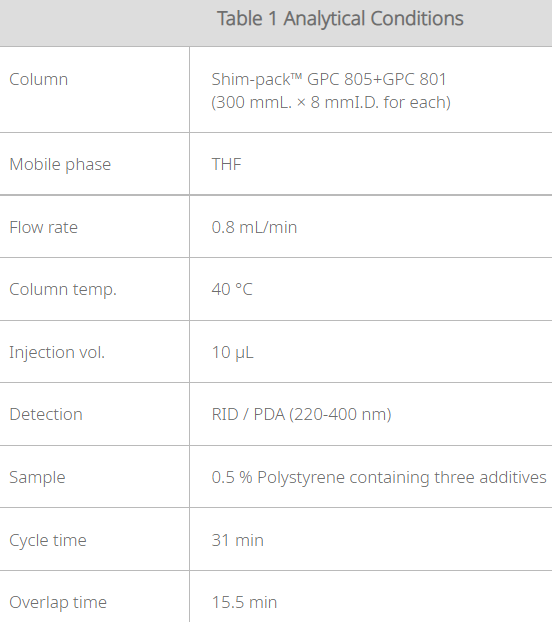 Bir numune ağırlığına yanıt veren bir kırılma indisi detektörü (RID), GPC için ortalama moleküler ağırlık ve polidispersiteyi hesaplamak için yaygın olarak kullanılır. Öte yandan, antioksidanlar gibi polimer katkı maddelerinin belirlenmesi için bir UV dedektörü kullanılır. Sonuç olarak, bu çalışma için seri olarak bağlanan bu iki dedektör kullanıldı. GPC kromatografide, hariç tutma sınırından önce neredeyse hiç elüat yoktur. Dolayısıyla, önceki enjeksiyondan alınan numune elüsyon bandı, mevcut analizde bu elüsyonsuz aralık içinde örtüşecek şekilde yönetilirse, kısa analiz çevrim süresi elde edilebilir ve sıralı analizlerde artan verim sağlar. İki veya daha fazla polimer katkı maddesi bulunduğunda, bu küçük katkı maddelerinin doğru tespiti zordur, çünkü katkı maddelerinin tam olarak ayrılması, bu polimer katkı maddeleri arasındaki küçük moleküler ağırlık farkı nedeniyle küçük eleme limitli GPC kromatografi kolonları kullanılarak bile neredeyse imkansızdır. Bu zorluğun üstesinden gelmek için, tek bir GPC analizi içinde pik dekonvolüsyon fonksiyonu ile polimer katkı maddelerinin artan ayrılmasını vermek için kromatografik sonuçların yanı sıra spektrometrik bilgi sağlayan bir fotodiyot dizi detektörü (PDA) kullanılmıştır.