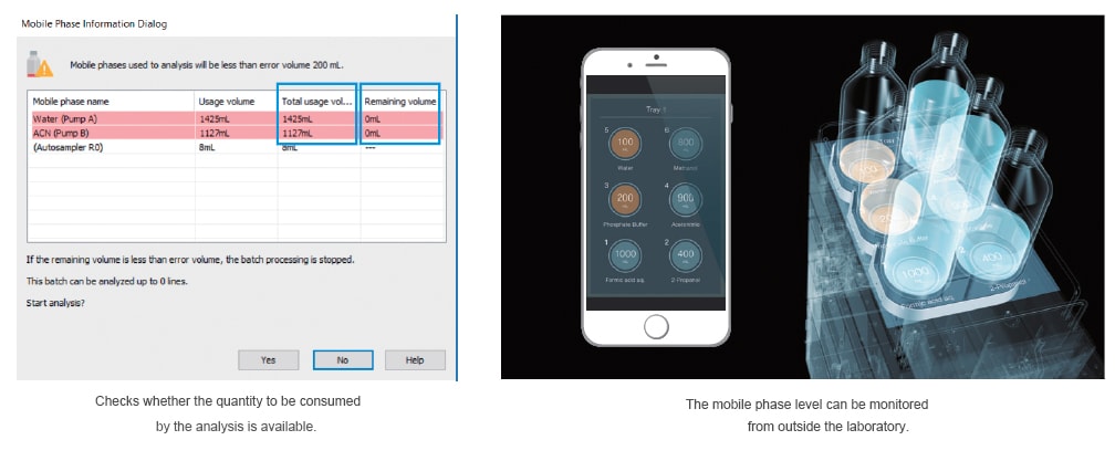 Rezervuar tepsisi ağırlık sensörleri (isteğe bağlı), on iki kapta mobil faz veya otomatik numune alıcı durulama solüsyonunun hacmini izlemek için kullanılabilir. Konteynerler ayrıca akıllı bir cihazdan uzaktan kontrol edilebilir. Artık, mobil faz ortasında analizin bitmesi konusunda endişelenmenize gerek kalmayacak, çünkü kalan hacim çok düşükse cihaz çalıştırmaya başlamadan önce sizi bilgilendirecektir.