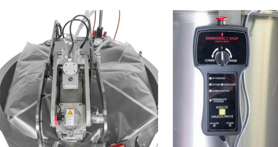 - 1.000 ve 2.000 L boyutları için pnömatik motor kaldırma tertibatı, dolum hacminin %20’si kullanıldığında uygun karıştırma için çarkı indirmek için kullanılır.