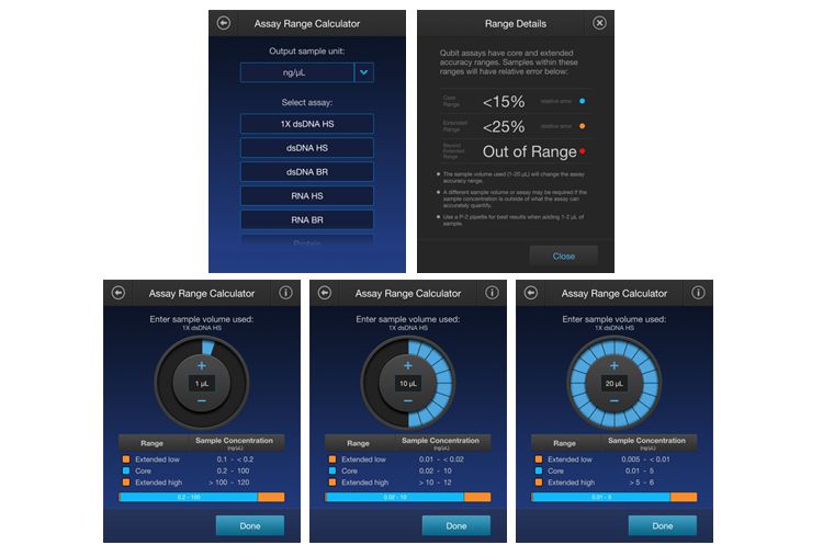 Qubit Flex Fluorometer üzerindeki kullanıcı dostu Test Aralığı Hesaplayıcısı, kullandığınız numunenin hacmine bağlı olarak tahlilinizin ölçülebilir aralığının nasıl değiştiğini size gösterecektir. Kullanabileceğiniz numune miktarı esnekse, beklenen konsantrasyon aralığı için kullanılacak ideal hacmi belirlemek için bu hesaplayıcıyı kullanabilirsiniz. Değerli numuneniz varsa ve yalnızca 1-2 µL kullanabiliyorsanız, bu hesaplayıcı konsantrasyonunuza bağlı olarak ne kadar doğruluk bekleyebileceğinizi size söyleyecektir.