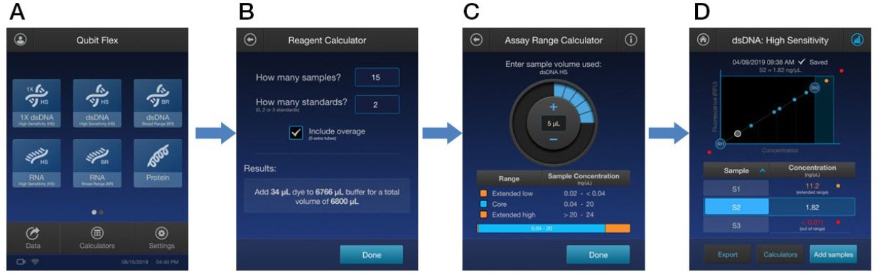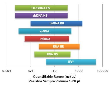 Tüm Qubit tahlilleri, Qubit Flex Florometre ile kullanım için optimize edilmiştir ve DNA, RNA veya protein için oldukça hassas ve seçicidir. Bu testler aynı temel protokol kullanılarak gerçekleştirilir: DNA ve RNA testleri için sadece 2 dakikalık veya protein testi için 15 dakikalık inkübasyon süreleri ile basitçe karıştırın ve okuyun. Qubit Testleri, herhangi bir başlangıç numunesi konsantrasyonu için geniş bir dinamik aralığı kapsar. Test aralığının kullanılan numune hacmine (1-20 µL) göre nasıl değiştiğini göstermek için Qubit Flex Florometre üzerindeki yerleşik Test Aralığı Hesaplayıcıyı kullanın.