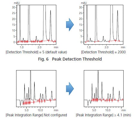 Kullanıcının pik algılama koşullarını ayarlamasına izin veren temel parametreler, bahsedilen pik taban çizgisi tipi, pik algılama eşiği ve pik entegrasyon aralığıdır. Algılama eşiği ayarını kullanarak, özel bir algoritma kullanılarak hesaplanan tahmini gürültü düzeyine göre belirli bir eşiğin altındaki tepe noktaları algılanmaz. Pik algılama eşik değerinin düşürülmesi, daha küçük tepe noktalarının algılanmasını sağlar. Pik entegrasyon aralığı, piklerin tespit edileceği zaman aralığını belirtir. Şekilde, varsayılan ayar olan 5’ten 2.000’e kadar olan pik algılama eşiğini değiştirerek üretilen sonuçlardaki değişikliği göstermektedir. Bu sezgisel kontroller, kullanıcının basit bir ayarlama ile küçük tepe noktaları algılamasını veya algılamamasını sağlar. Şekilde, tepe entegrasyon aralığını ayarlamanın bir örneğini göstermektedir. Pik entegrasyon aralığını ayarlamadan, tüm tepeler aralığın içine düşer ve tepe-taban çizgisi negatif tepelerden etkilenir. Negatif tepe noktaları hariç tutmak için tepe entegrasyon aralığının ayarlanması, kullanıcının uygun bir taban çizgisi yapılandırmasına olanak tanır.