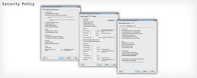 Sistemde herhangi bir olay meydana geldiğinde veri ve belge e-posta iletim fonksiyonlarının güvenilirliğini sağlamak için bir denetim izi kurulabilir. Kullanıcı hesapları, parola uzunluğu, karmaşıklığı ve geçerlilik süresinin belirtilen gereksinimleri karşılaması gereken parolalar kullanılarak yönetilir. Yasadışı erişimi önlemek için kilitleme işlevlerini ayarlamak ve kayıtlı bir kullanıcının silme ve değiştirmesini ayarlamak da mümkündür.
