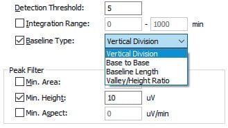Bununla birlikte, i-PeakFinder, belirli bir tepe-baselin işleme türü gerçekleştirmek için temel ayarlarında ayarlanabilir parametrelere sahiptir ve kullanıcının her durumda optimum tepe-temel türünü kolayca uygulamasına olanak tanır. Şekilde, ayarlar penceresindeki tepe taban çizgisi tipinin bir listesini gösterir, Şekil 4, ana bir tepe noktasının tabanında kaynaştırılan bir safsızlık tepe noktasının tepe taban çizgisi tipi ayarının sonucunu gösterir. Belirli bir duruma uygun pik-baselin işleme, birkaç temel parametrenin değiştirilmesiyle basitçe gerçekleştirilebilir.