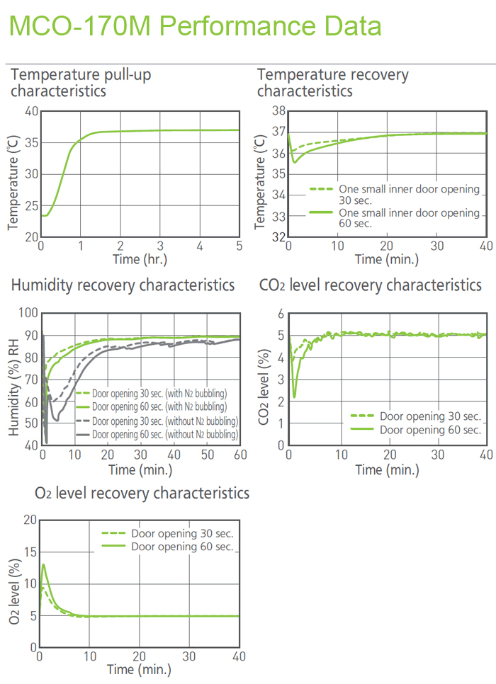 Çift Kızılötesi sensör, birden fazla kapı açılmasından sonra bile aşırı hızlı CO2 geri kazanımı sağlarken, benzersiz katı Zirkonya O2 sensörü, in vivo koşulları simüle etmek için fizyolojik oksijen seviyelerinin hassas kontrolünü sağlar.