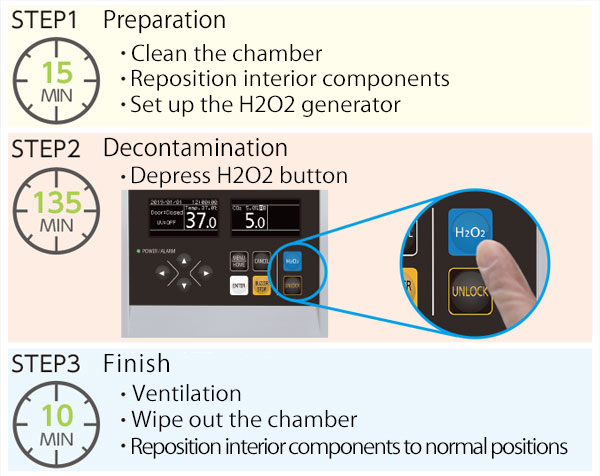 Rejeneratif tıp protokolü için de yaygın olarak kullanılan hidrojen peroksit (H2O2) kullanan yüksek hızlı dekontaminasyon sistemi, dekontaminasyonu yaklaşık iki buçuk saatte tamamlayarak araştırmacıların laboratuvar iş verimliliğini arttırır ve içindeki hücre kültürü inkübatörünün dekontaminasyonunu sağlar.