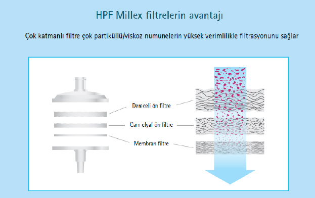 - HPF Millex çok katmanlı filtreler genel laboratuvar filtrasyonları ve fazla miktarda parçacık içeren numunelerin filtrasyonu için uygundur.