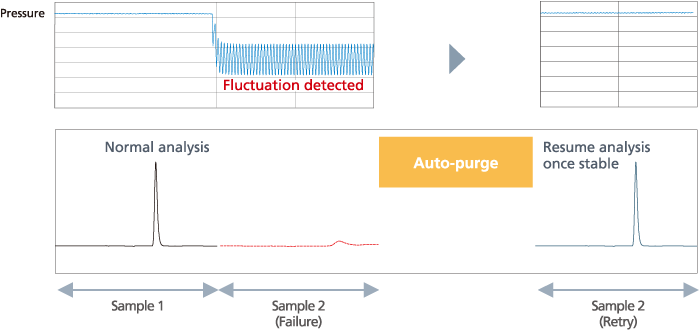 Olağandışı bir dalgalanma tespit ettiğinde, analizi otomatik olarak duraklatabilir, akış yolunu temizleyebilir ve normal basınca geri dönüşü onayladıktan sonra analizi yeniden başlatabilir.