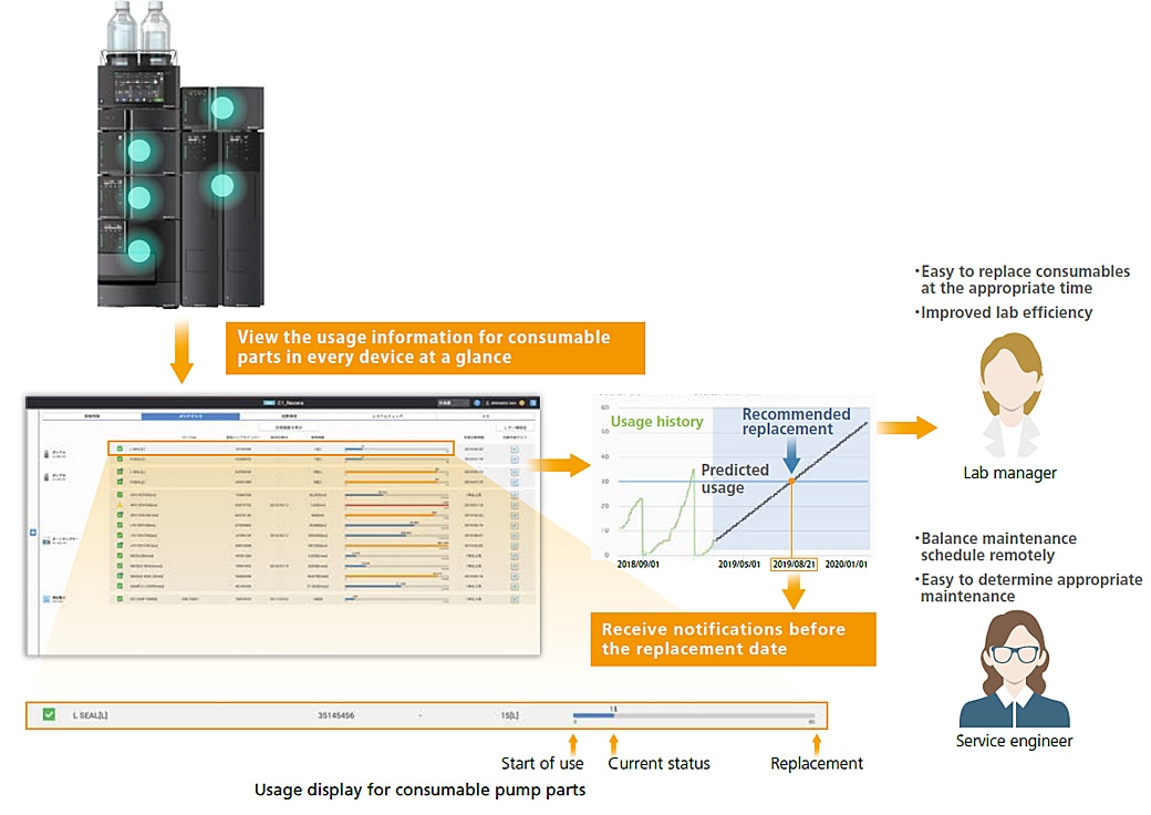 Her Nexera Sıvı Kromatografi bileşeni, sarf malzemelerinin durumunu, fabrikadan sevk edildikten sonra sarf malzemelerinin izlenebilirlik bilgilerini ve çeşitli günlükleri ve hata bilgilerini SHIMADZU LabTotal Smart Service Net bulut sistemine otomatik olarak aktarır. Bu bilgileri kullanarak sistem, sarf malzemesinin değiştirilmesi için zamanlama önerir. Sorunlar, Shimadzu servis mühendisleri tarafından uzaktan teşhis edilebilir. Bu, sistemin optimum durumda tutulabileceği ve ekipman yönetim maliyetlerinin de azaltılabileceği anlamına gelir.
