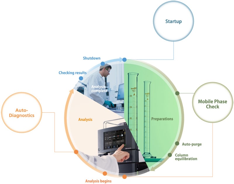 Nexera Yüksek Performanslı Likit Kromatografi Sistemleri, otomatik temizleme, dengeleme ve temel kontrolleri önceden tamamlayabilmesi ve laboratuvara varır varmaz analize hazır olabilmesi için belirli bir zamanda başlayacak şekilde ayarlanabilir. Ayrıca sistem, başlatmadan analize ve kapatmaya kadar tüm yol boyunca kullanıcı müdahalesi olmadan çalışacak şekilde önceden ayarlanabilir.