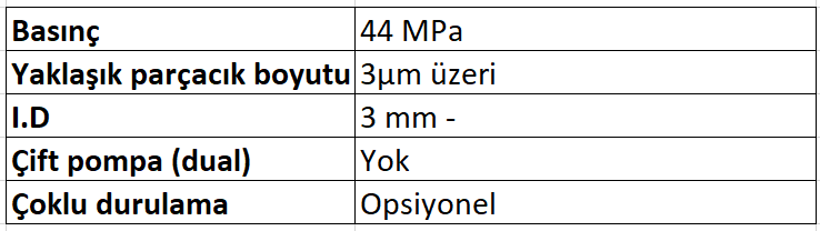 • 1-14 pH aralığı ile maksimum 44 MPa/440 bar (5 mL/dk’ya kadar) basınç.