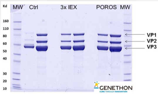 Jel ayrıca benzer saflığı ortaya çıkarır ve viral vektör AAV9 için kapsid viral protein (VP) topolojisi, viral yapısal proteinler VP1, VP2 ve VP3’e karşılık gelen bantları göstererek doğrulanır.