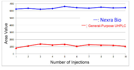 Aşağıdaki şekil, Nexera Bio ve genel amaçlı bir UHPLC sistemi kullanılarak bir ATP standart solüsyonunun (1 mg/L) 10 kez art arda analiz edilmesinden elde edilen pik alan değerlerinin karşılaştırmasını gösterir.