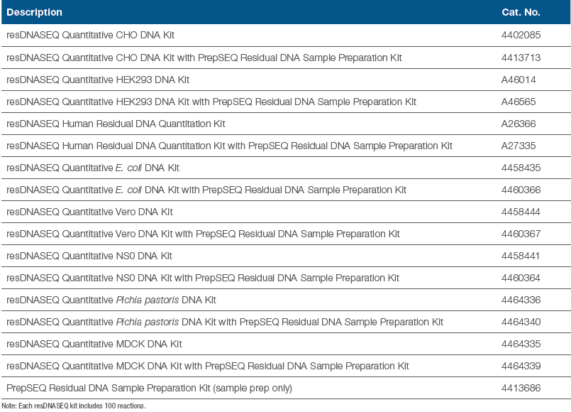 Applied Biosystems™ resDNASEQ™ Konak Hücre Kalıntı DNA Kantitasyon Kiti (Host Cell Residual DNA Quantitation System), rekombinant proteinler için ekspresyon sistemleri olarak kullanılan insan hücre dizilerinden konak hücre DNA'sının saptanmasına yönelik kantitatif PCR (qPCR) tabanlı bir sistemdir.