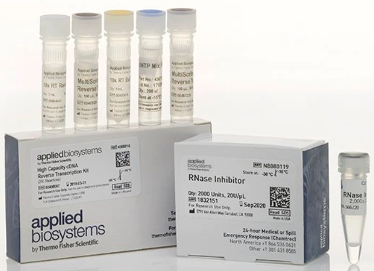 RNase İnhibitörlü Yüksek Kapasiteli cDNA Ters Transkripsiyon Kiti, tek bir 20 µL reaksiyonda 2 µg’a kadar toplam RNA’nın tek iplikli cDNA’ya kantitatif dönüşümü için gerekli tüm bileşenleri içerir. Bu özel kit ayrıca 5 tüp RNase inhibitörü (her biri 200 µL) içerir.