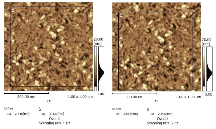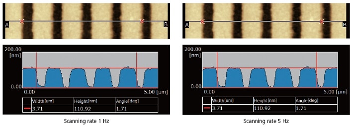 Izgara yüzey topolojisi, 1 Hz ve 5 Hz’lik bir tarama hızında gözlendi. Kesit profil analizi ile yapılan ölçüm, her ikisinin de aynı sonuçları verdiğini göstermektedir.