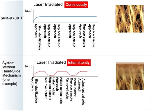 Atomik Kuvvet Mikroskobu ile yüksek hızlı yanıt ve optimizasyon yazılımları ve kontrol sisteminin tasarımı sağlayan yeni geliştirilmiş HT tarayıcı sayesinde, görüntü verilerinin elde edilmesi artık geleneksel hızın 5 katı veya daha fazla (bizim oranımız) ile sağlanmaktadır. Tarayıcı kolayca değiştirilebilir, böylece mevcut tarayıcılar kullanılabilir. HT tarayıcı, yüksek verimli gözlem sağlamak için mevcut bir SPM-9700 ünitesine de eklenebilir.