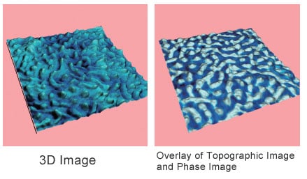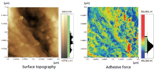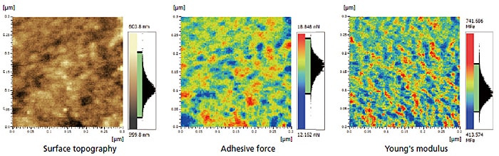 Haritalama analizi, yapışma kuvveti ve Young modülünün yanı sıra yüzey topografisini ölçmek için kullanılabilir. Şekil, bir plastik film yüzeyi üzerinde yalnızca 300 nm genişliğindeki lokalize bir alanda Young modülünün nicel bir görselleştirmesini göstermektedir. (Örnek kaynak: MORESCO).