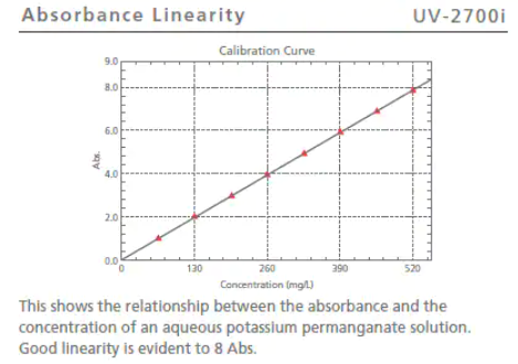 Genel bir çift monokromatör ile donatılmış bir cihaz olması durumunda, kapsayabilecek absorbans yaklaşık 5 ila 6’dır, ancak UV-2700i, %0.00001’lik bir geçirgenlik değeri ile 8 Abs’ye kadar bir aralık sunar (100 milyonda 1 kısım). ). Bu sistem, emsalsiz bir hassasiyetle yüksek düzeyde absorbans ölçümleri gerçekleştirir. Yüksek konsantrasyonlu numuneleri olduğu gibi ölçmenin yanı sıra, numuneleri seyreltme ihtiyacını ortadan kaldıran sistem, polarizasyon filmlerinin iletim özelliklerini değerlendirmek için de uygulanabilir. 400 nm ila 650 nm aralığındaki dalga boyları 8 Abs’ye kadar ölçülebilir.