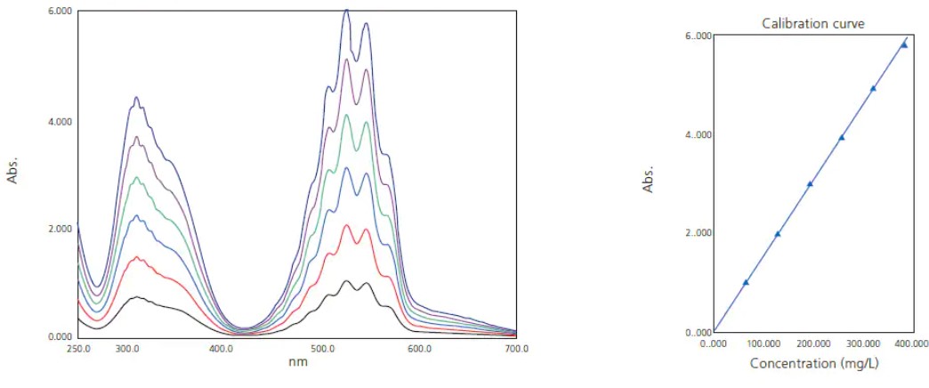 Aşağıdaki görselde soldaki şekil, altı konsantrasyon seviyesinde sulu KMnO4 çözeltisinin ölçülmesiyle elde edilen spektrumları göstermektedir. Referans ışını tarafına bir ağ filtre yerleştirildi ve absorbans seviyesi 6’ya kadar ölçüm yapmak için diferansiyel bir yöntem kullanıldı. Negatif absorbans kullanılması, yüksek absorbans seviyelerinde bile az gürültü ile ölçüm yapılmasını sağlar. Sağdaki şekil, sulu KMnO4 çözeltisi için 525nm civarında pik absorbansları kullanan kalibrasyon eğrisini gösterir ve doğrusallığın absorbans seviyesi 6’ya kadar korunduğunu gösterir.