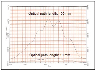 Bir numunenin konsantrasyonu standart 10 mm’lik optik ışık yollu küvet ile ölçüm için yeterli değilse, optimum absorpsiyon hassasiyetine ulaşmak amacıyla daha uzun optik ışık yollu küvetler kullanılabilir. Aşağıdaki şekilde, potasyum permanganatın absorpsiyon spektrumu 100 mm’lik küvet ile alındığında, 10 mm’lik küvet ile alındığı halinden daha net oluşabilmektedir.
